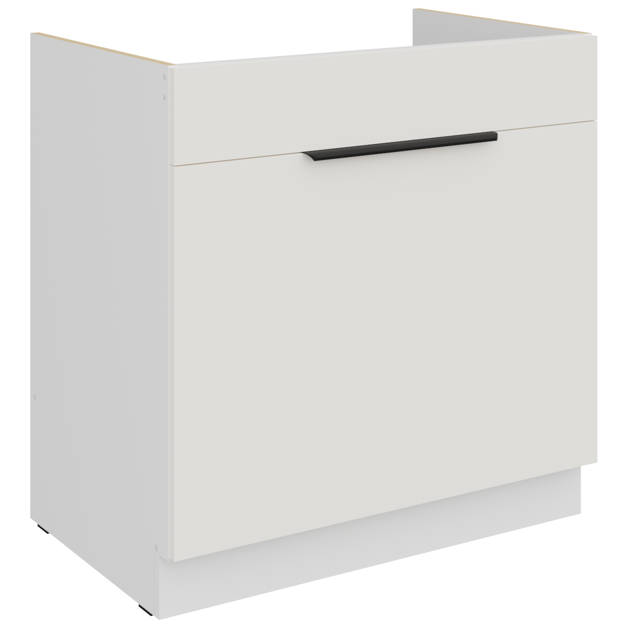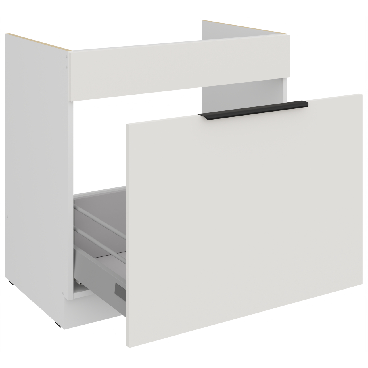 Szekrény belső része fehér kivitelben. A fogantyúk furatai nem átmenő furatok (vakfuratok). Alsó konyhaszekrény mosogatóhoz. |