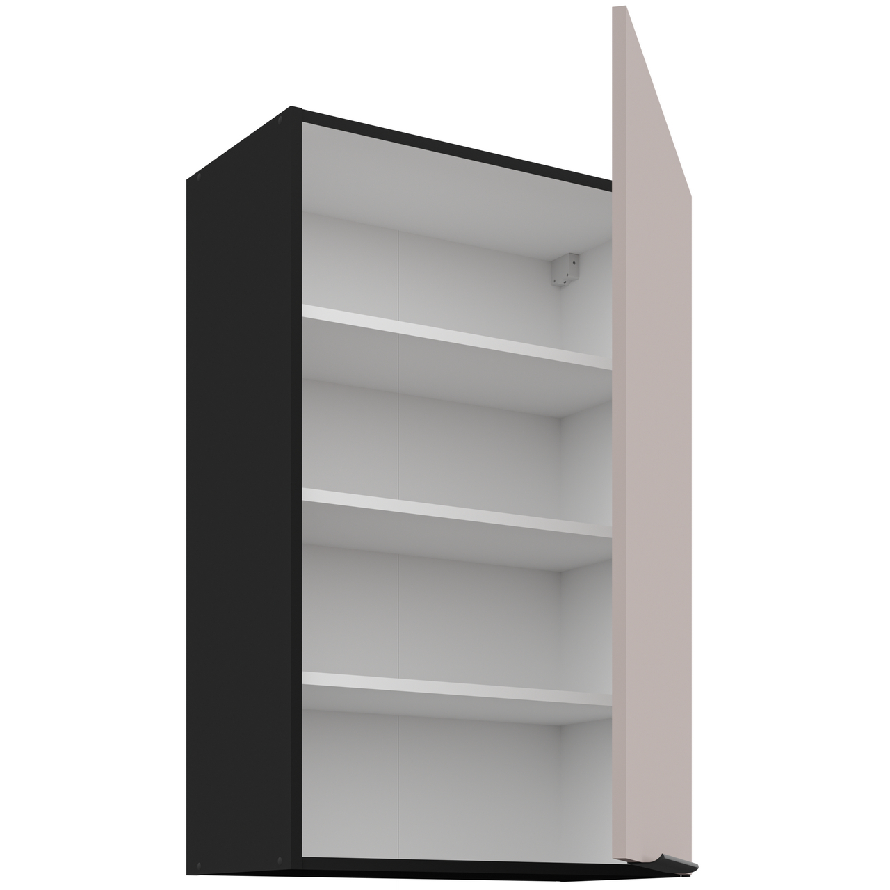 Szekrény belső része fehér kivitelben. A szekrény három polcos. |
