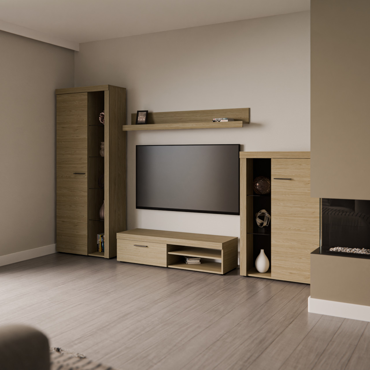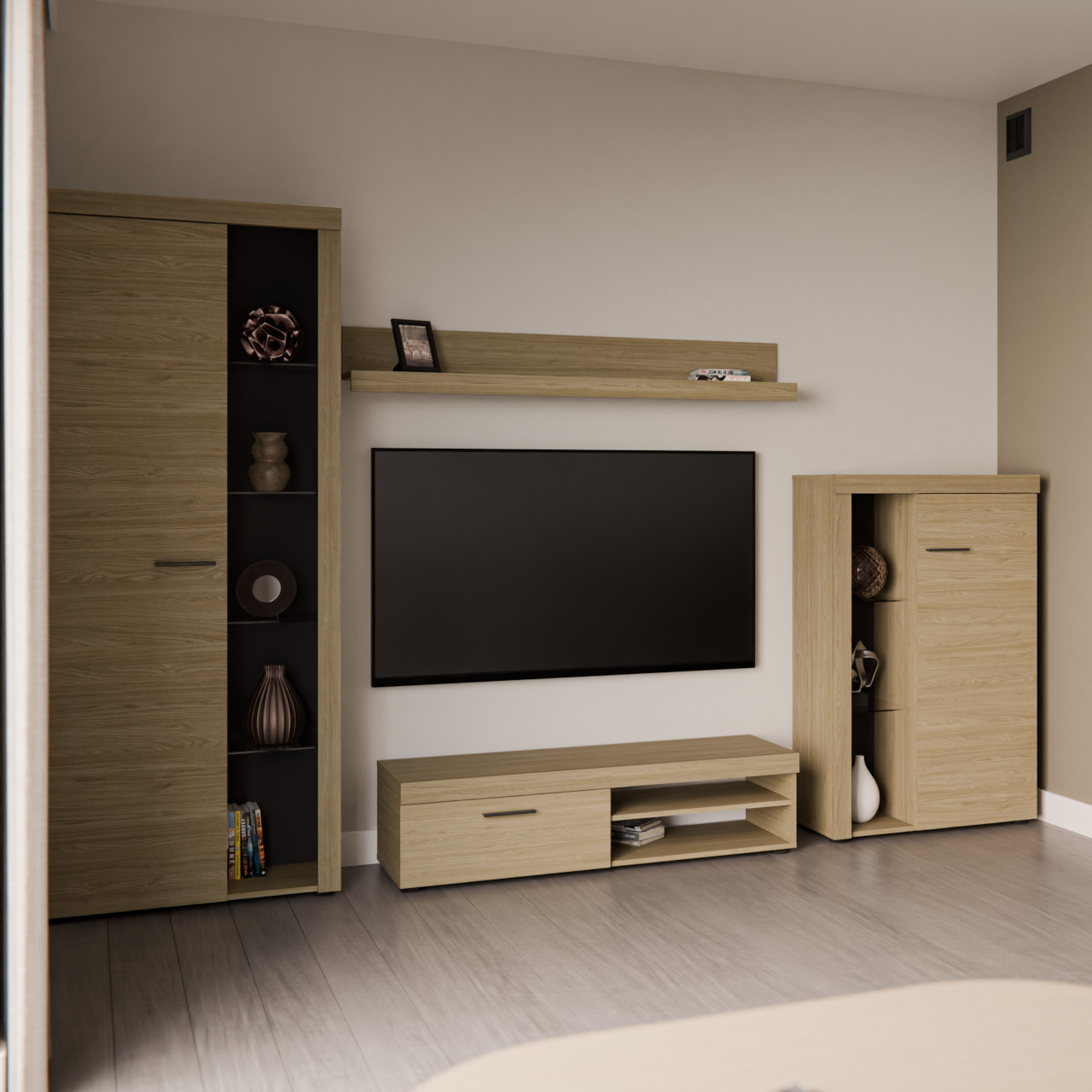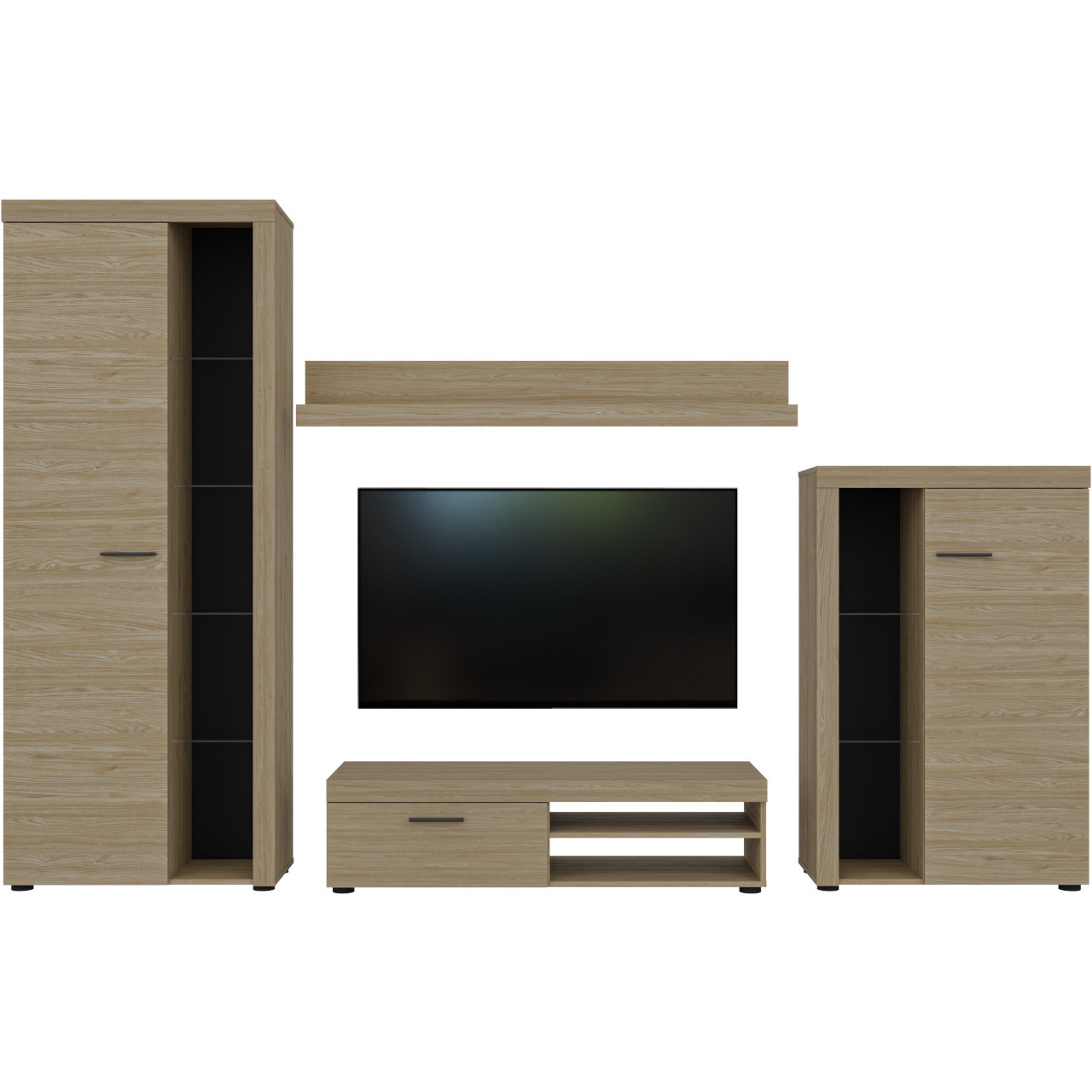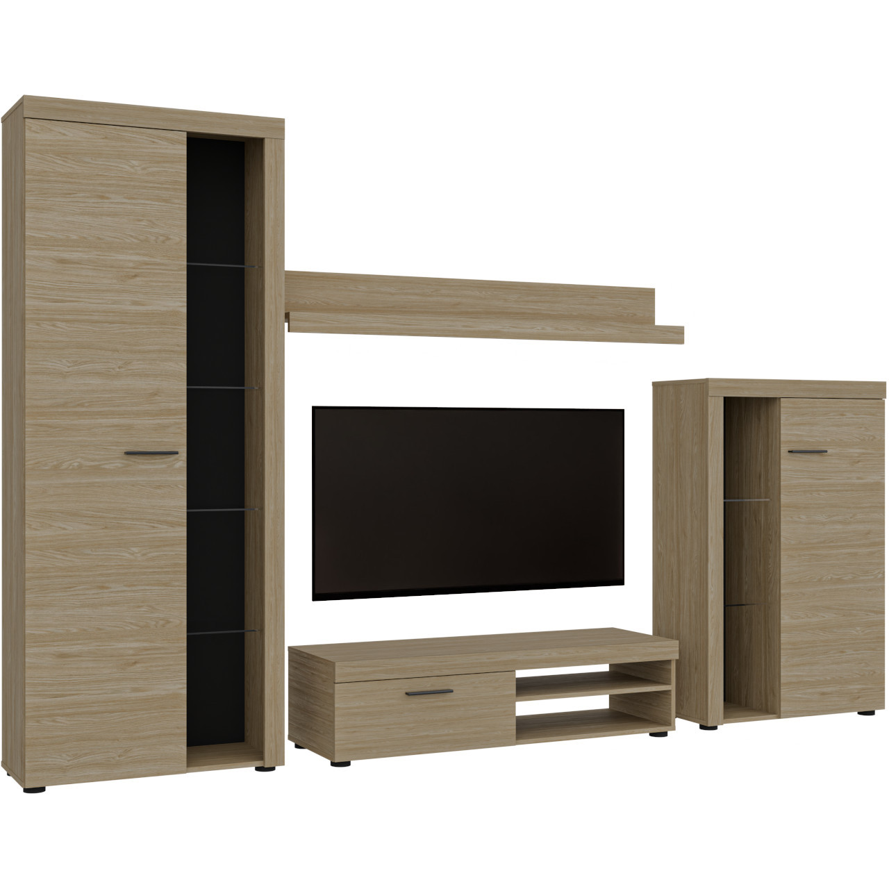 Magas vitrin (75/190/33,8) TV szekrény (120/31,5/40,3) Fali polc (140/20,5/19,5) Alacsony vitrin (75/117/33,8) |